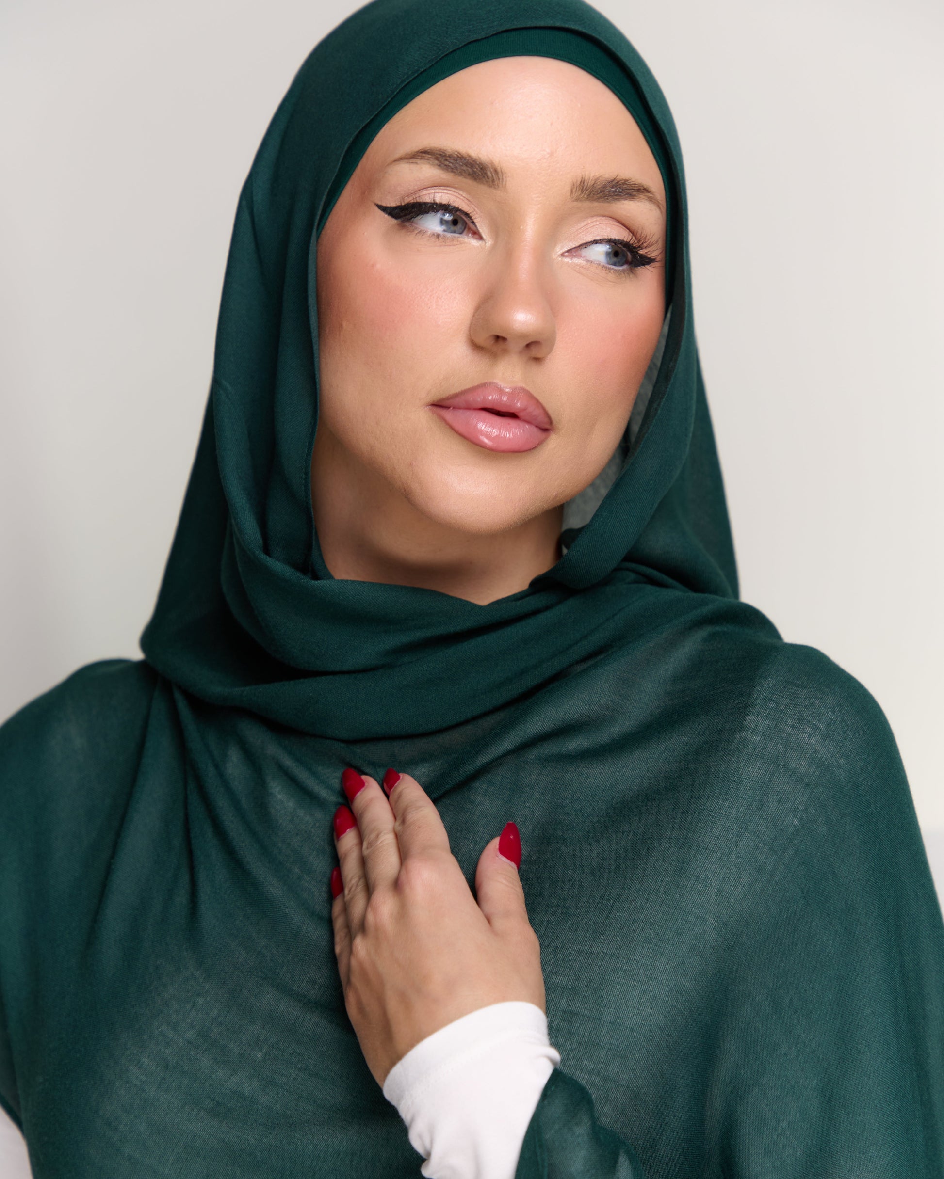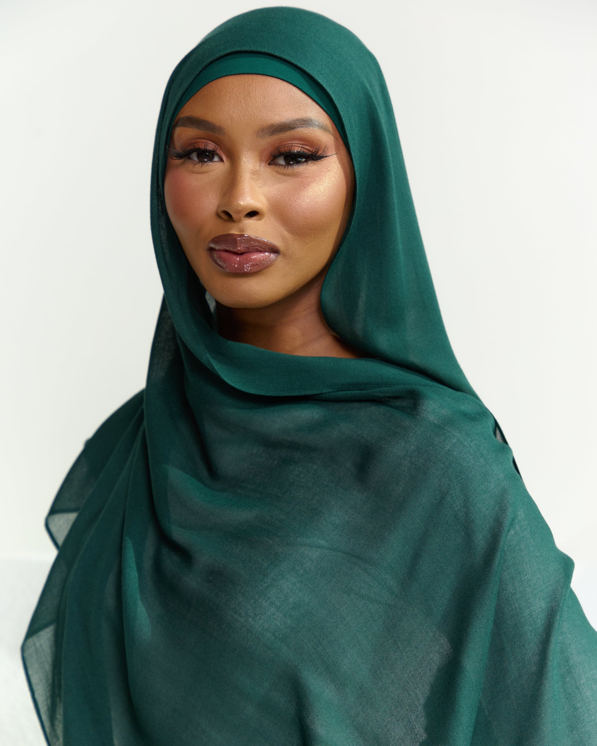 The Jade Leaf Modal Hijab presents a rich, deep green shade reminiscent of lush foliage, perfect for adding a vibrant, yet earthy touch to your look.